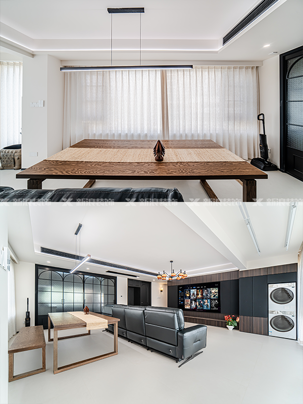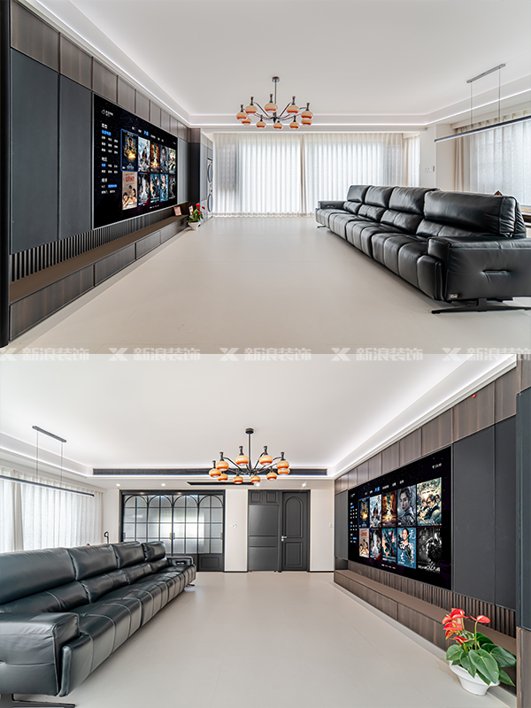 整墻定制電視柜,黑橡與煙熏橡木交織,深色木紋配黑色柜門高級(jí)感爆棚。