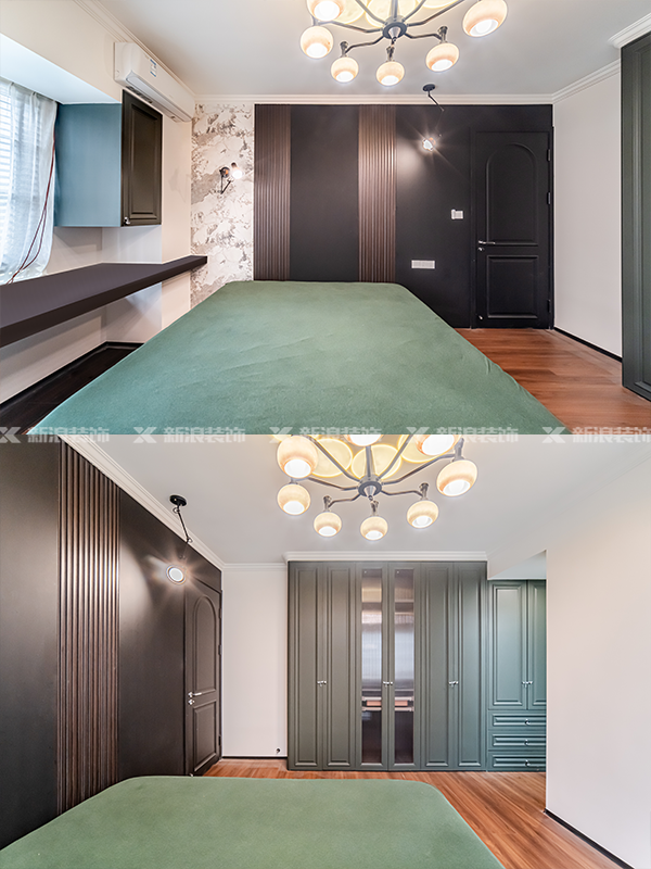 臥室定制背景墻,原野綠衣柜搭配木地板,溫馨氛圍瞬間彌漫。
