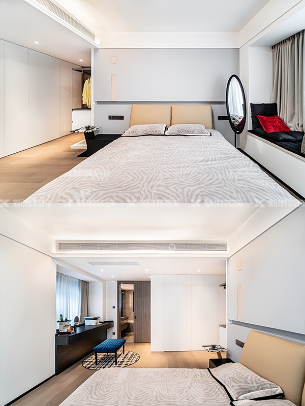 它不僅完美解決了 次凈衣區(qū)的收納難題,更重要的是,它本身就像一件藝術(shù)品!輕盈懸浮的體塊感,大大增加了觀賞性,每天走進臥室都是享受